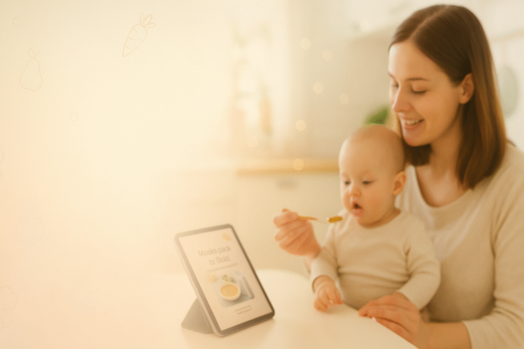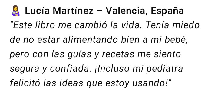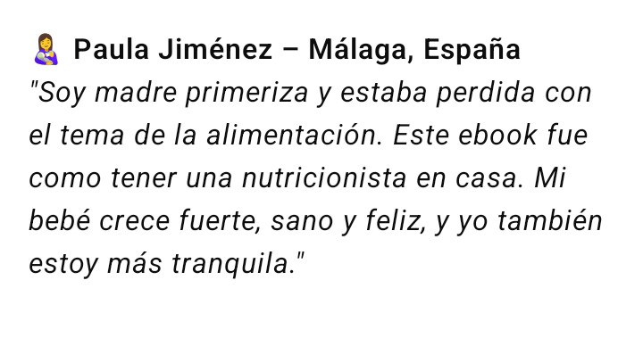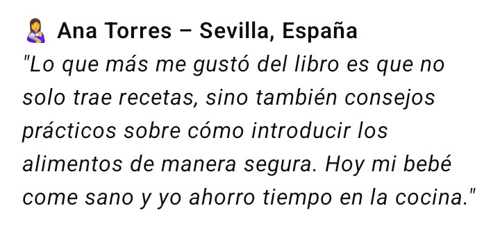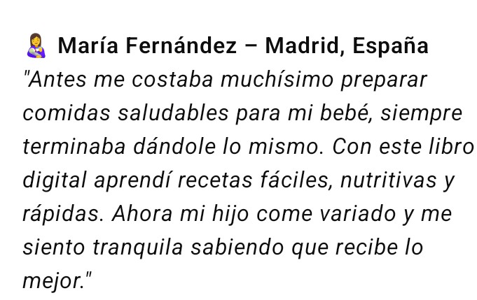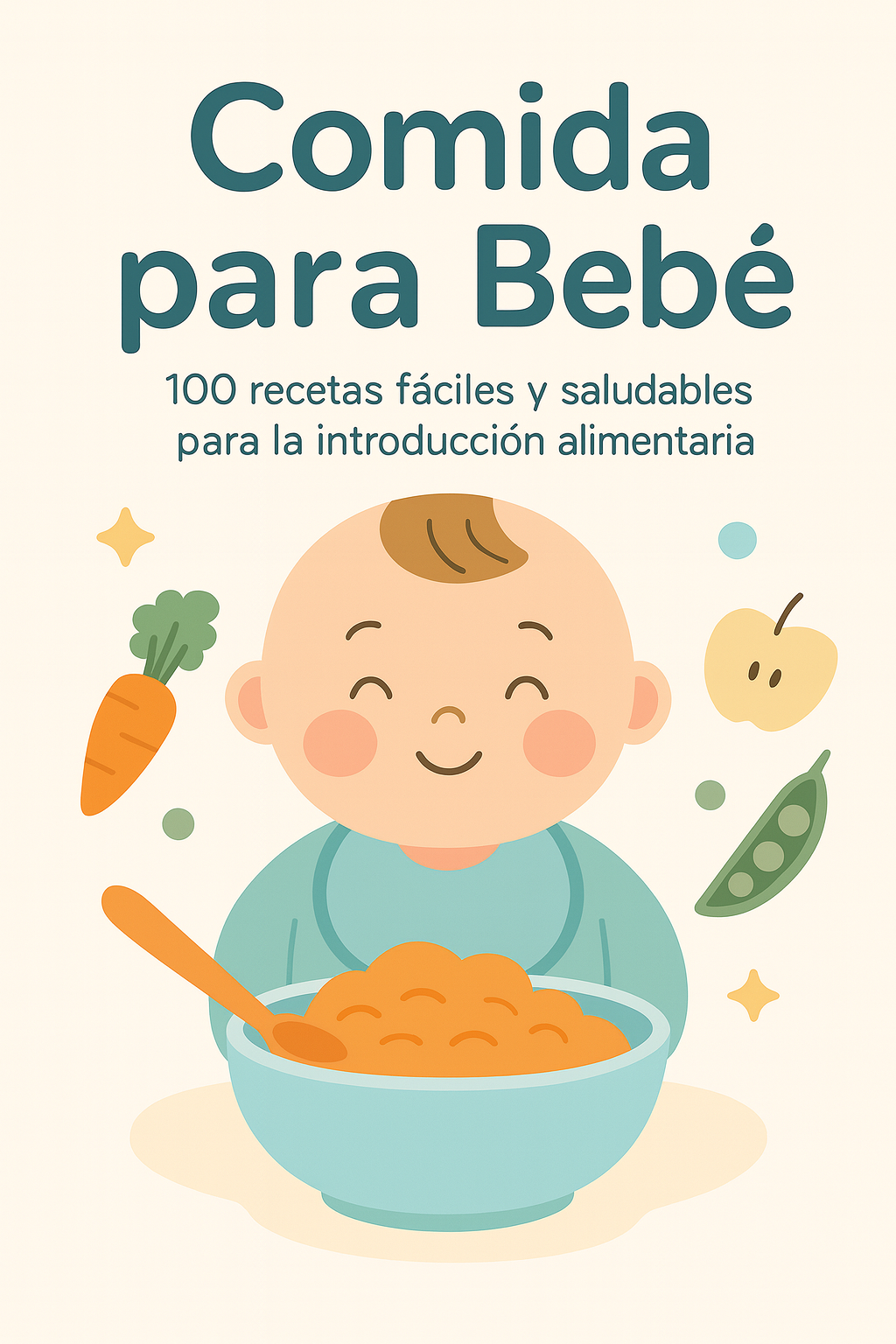 Incluye un calendario mensual de menús para bebés, recetas día a día, listas de compras, guías de porciones por edad, tips de conservación, sustituciones y mini-tutoriales de preparación rápida.